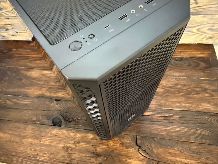 I/O panel skrinky je pomerne netradične roztiahnutý takmer po celej dĺžke skrinky – nachádza sa tu tlačidlo pre zapnutie, LED diódy (pre zapnutie a disk), USB C a dva USB-A rozdelené v strede jackom pre slúchadlá a mikrofón.