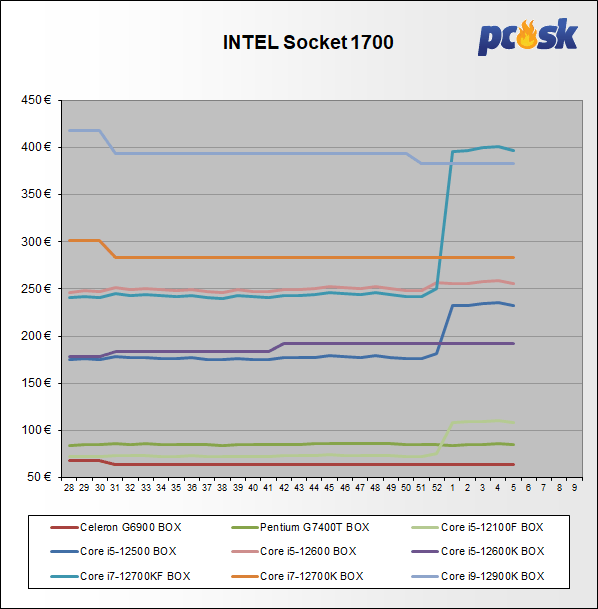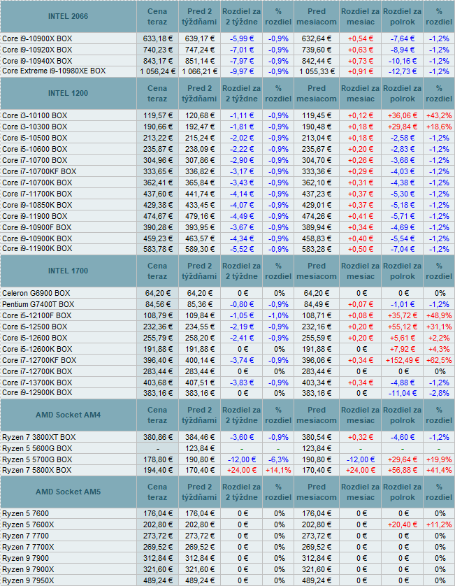 Ceny procesorov INTEL klesi do -1,0%, zatiaľ čo u AMD boli zmeny od +14,1% do -6,3%. Z prehľadu vypadol Core i5-10400 BOX (1200).