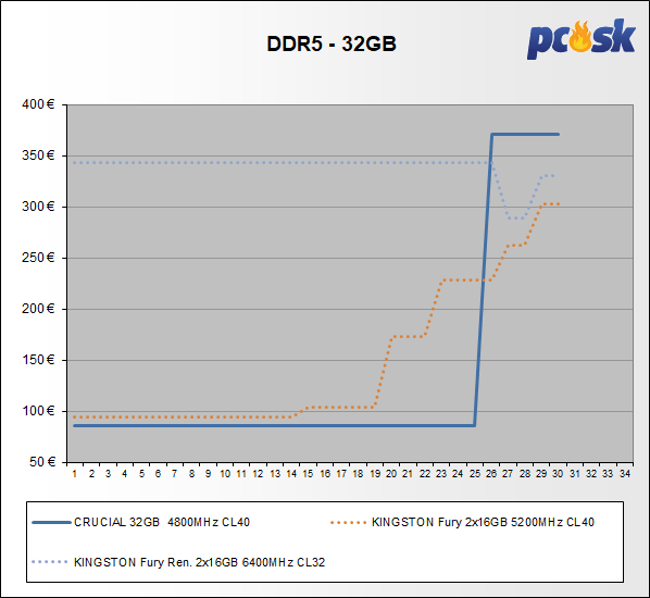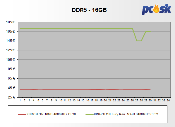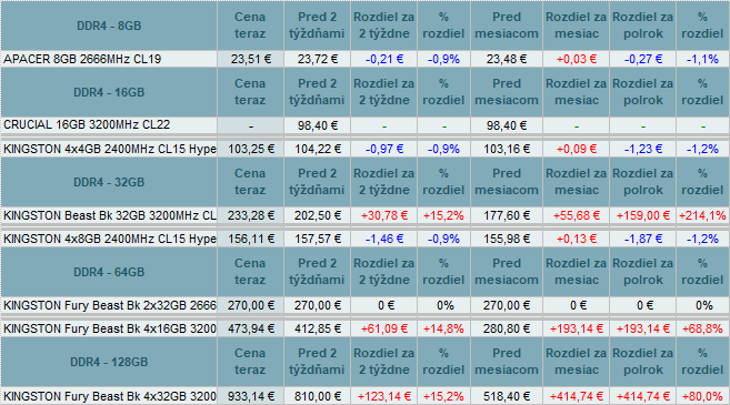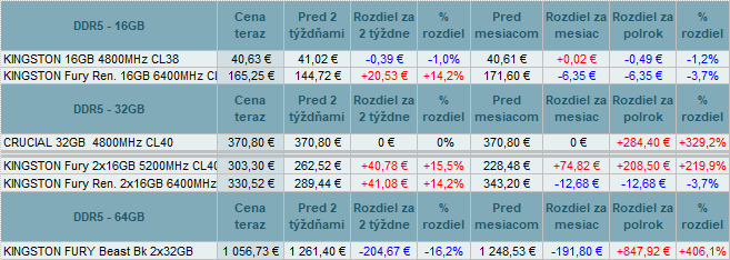 Pamäte stále pokračujú v zdražovaní. DDR4 menili ceny od +15,2% do -0,9% a DDR5 od +15,5% do -16,2%. Z prehľadu vypadli DDR5 CRUCIAL 2x16GB 5600MHz CL40 a CRUCIAL 64GB 4800MHz CL40.