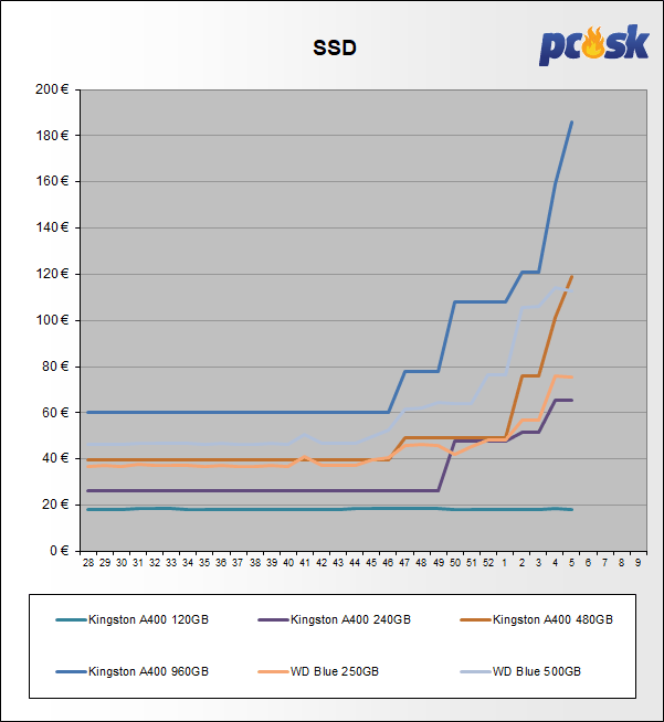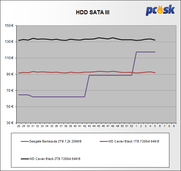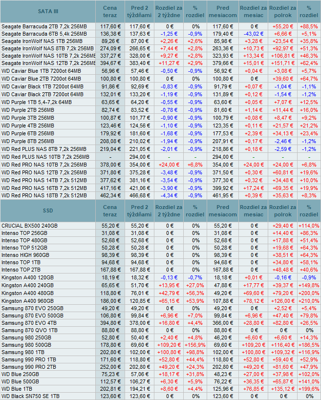 Platňové disky menili ceny od +6,8% do -0,9%. U SSD bol nárast cien až do závratných +156,9%. Len jeden model zlacnel o -0,7%.Z prehľadu vypadol SATA3 disk WD Purple 10TB 7,2k 256MB a SSD: Samsung 870 QVO 4TB, WD Black SN750 500GB.