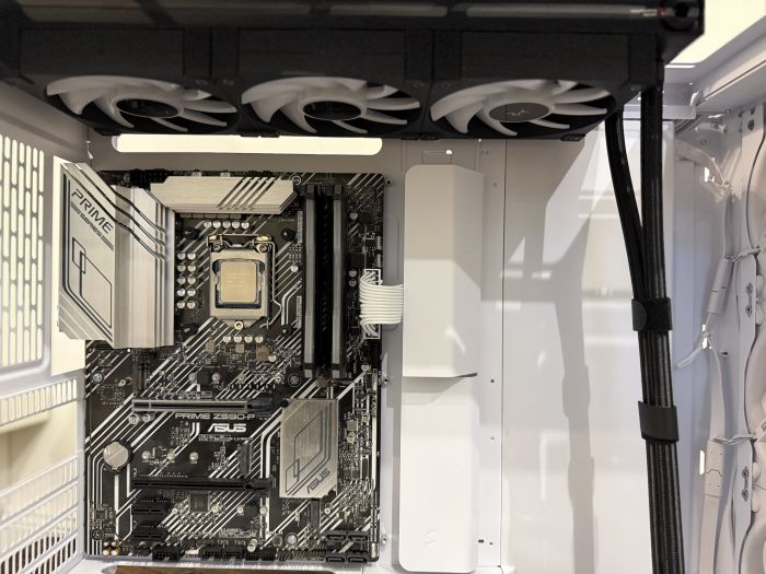 Celkovo vyzerá takáto zostava veľmi elegantne, samozrejme krajšia - celo biela doska, by sem pasovala oveľa lepšie ale to už by bolo treba vymeniť aj AiO chladič. Teploty CPU, či GPU boli na skvelých hodnotách aj bez ďalších ventilátorov - na chladenie slúžili len predné ventilátory.