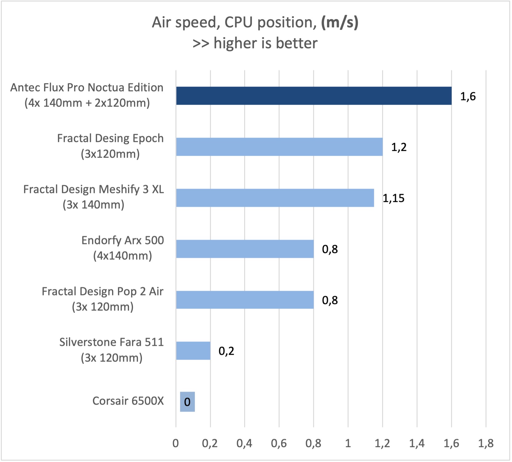 Možno vás už napadla otázka, či táto skrinka má lepšie chladenie ako Antec Flux Pro, ktorá je rovnako dodávaná s 5timi ventilátormi. Ohľadom tohto som mal diskusiu s Jakobom (Noctua), ktorý mi potvrdil, že ich interné testy potvrdili zlepšenie chladenia CPU v priemere o 3,5 stupňa Celzia u CPU a 2 stupňa Celzia u GPU pri kombinovanom teple 800W.