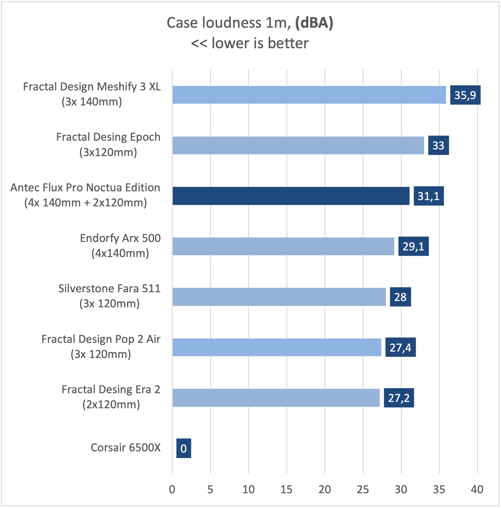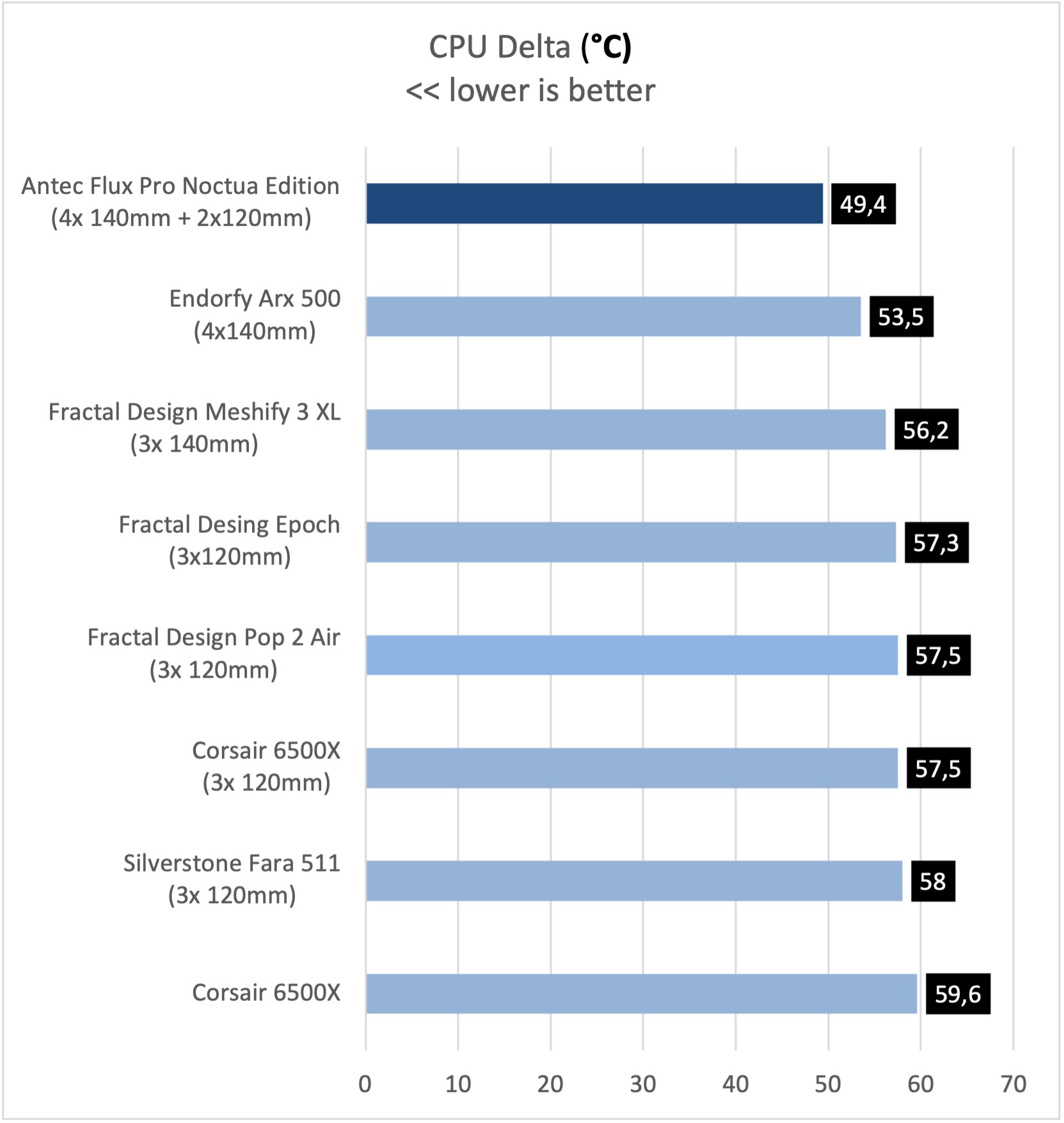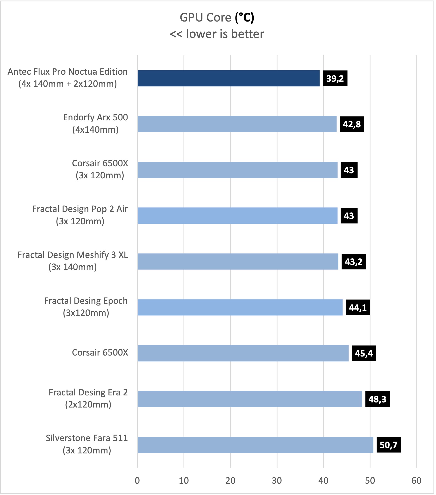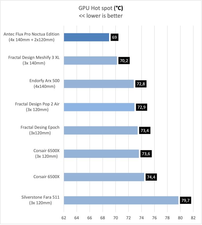 Asi je každému jasné, že skrinka s 5timi ventilátormi Noctua, bude atakovať prvé priečky v testoch. V tom našom, skončila Antec Flux Pro Noctua edition s prehľadom na prvom mieste. Rovnako v testoch CPU aj GPU.