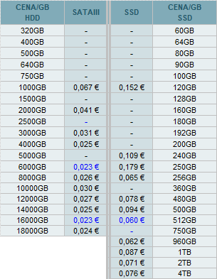 Najlepšie ceny za 1GB diskovej kapacity sú nasledovné: SATAIII 6TB, 16TB a SSD 512GB.
