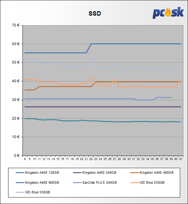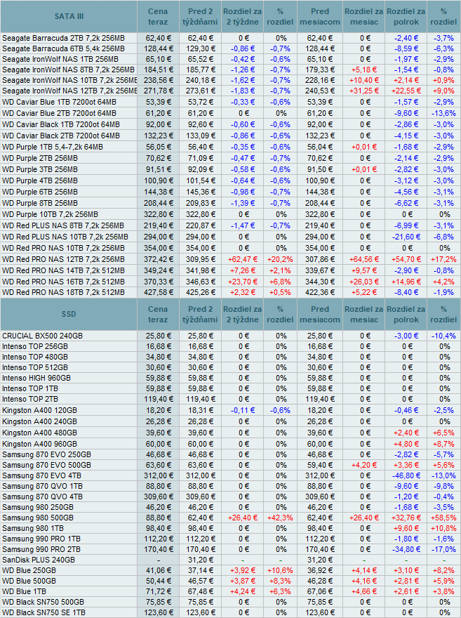 Platňové disky menili ceny od -0,7% až do +20,2%. U SSD boli ešte výraznejšie a to od -0,6% až do vysokých +42,3%.