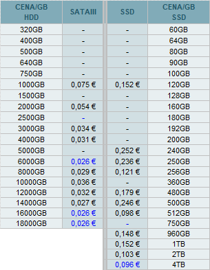 Najlepšie ceny za 1GB diskovej kapacity sú nasledovné: SATAIII 6TB, 16TB, 18TB a SSD 4TB.