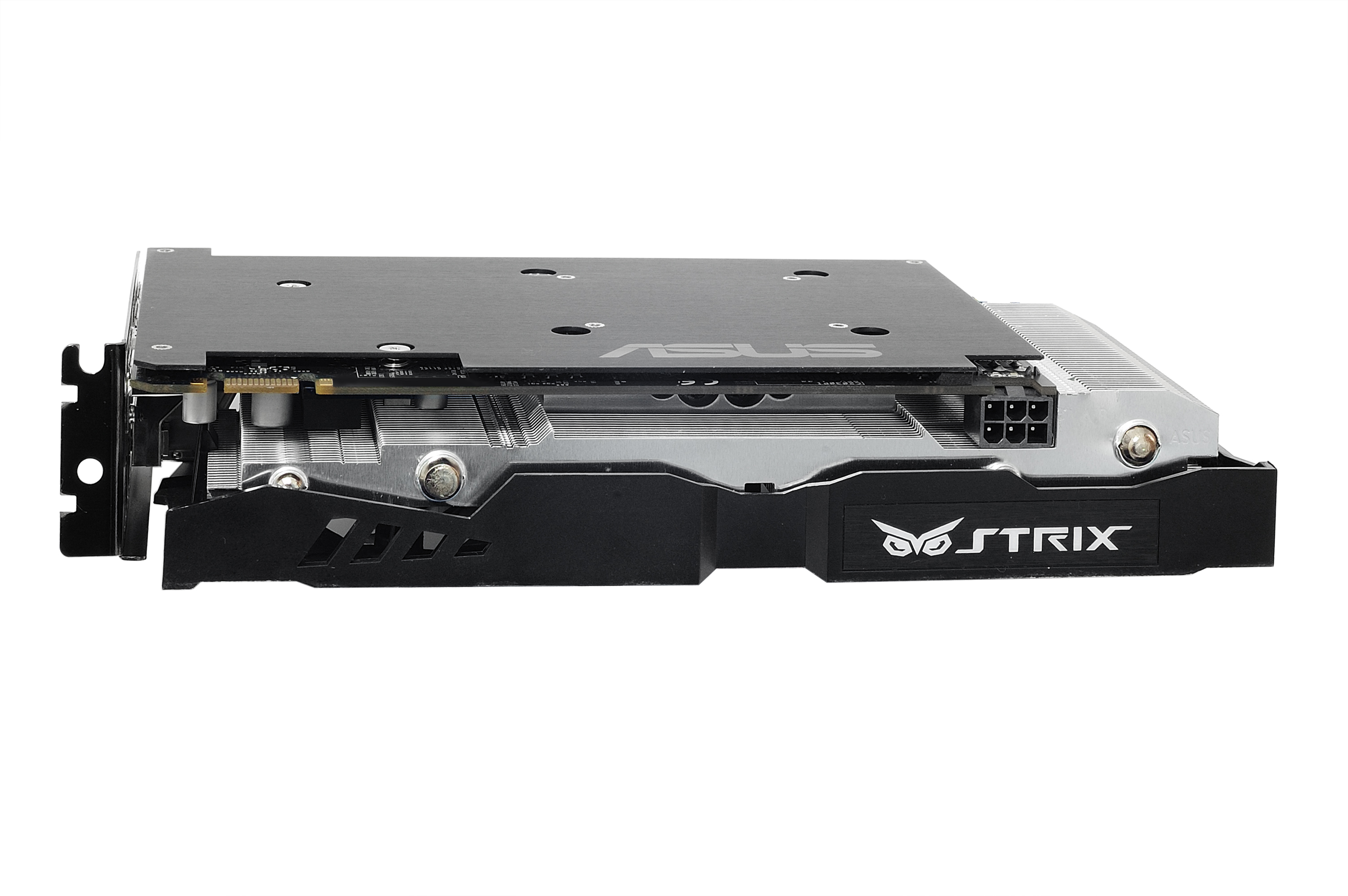 Z opačnej strany by som očakával pohľad priamo na osadené komponenty – opak je však pravdou. ASUS zadnú časť pokryl kovovým krytom. Aj napriek tomu spod krytu vykúka niekoľko hlavičiek skrutiek, ktoré držia chladič a plošný spoj pokope. Celkovo karta vyzerá skutočne zaujímavo a minimalisticky. Ak si potrpíte skôr na minimalistický dizajn, ASUS Vás s určitosťou uspokojí.