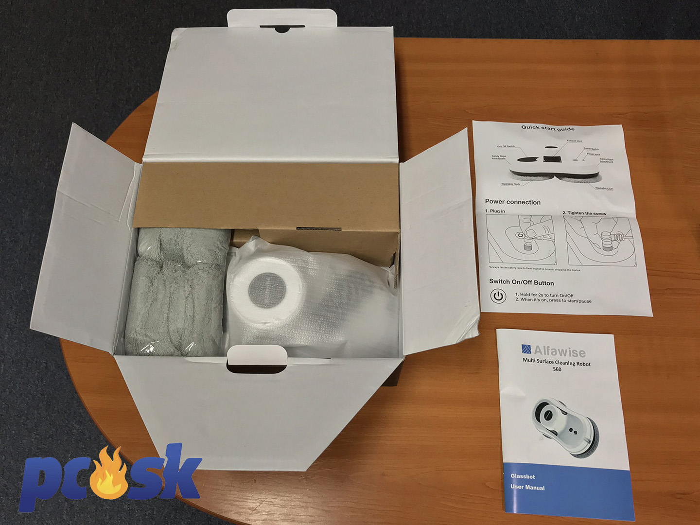 V balení sa nachádza všetko potrebné a aj čosi naviac. K robotickému umývaču je pribalených celkom 14 čistiacich návlekov, 2 náhradné obruče na návleky, napájací adaptér s európskou koncovkou, 4 metrový predlžovací kábel s uzamykateľnou koncovkou, diaľkový ovládač, poistné lanko, fľaštička s rozprašovačom a návod v anglickom, francúzskom, španielskom a talianskom jazyku. Návod je stručný a zrozumiteľný a nemám k nemu vážnejšie výhrady.