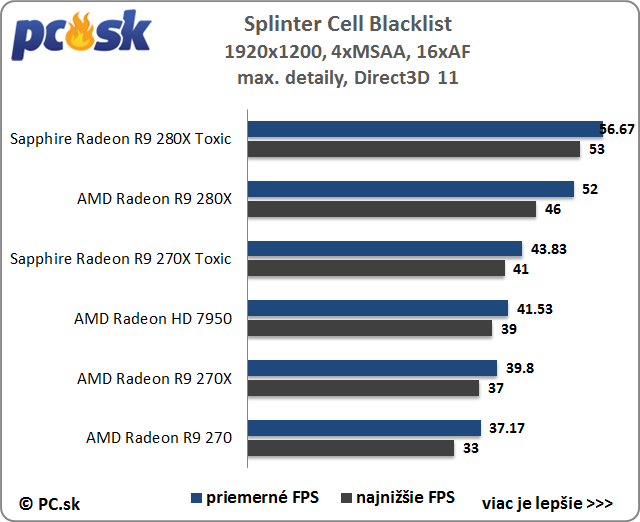 Referenčné frekvencie u R9 280X 1000 MHz u jadra a 1500 MHz u pamätí. Venujme sa najvyššiemu modelu od Sapphire, ten dostal od inžinierov slušne "naložené", jeho frekvencie sa dostali až k 1150/1600 MHz.