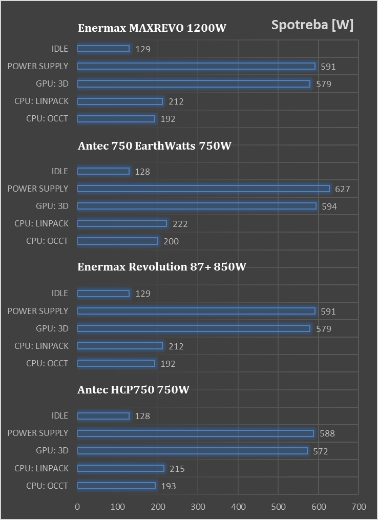 Antec preukázal, že pri zdrojoch to vie. Nie je však Antec ako Antec a ako pri iných komponentoch, aj pri zdrojoch treba vyberať z jednotlivých sérií nielen podľa toho, čo si môže užívateľ dovoliť, ale aj podľa toho, čo od samotného produktu očakáva. HCP750-tka spĺňa všetko, čo by poriadny zdroj spĺňať mal. Má vysokú účinnosť v širokom spektre, malé zvlnenie na +12V vetve, a neurazí ani vizuálne. Osadené sú vysoko-kvalitné súčiastky, ktoré predpovedajú dlhú životnosť samotného produktu. Antec si je istý a svoj HCP750 istí päťročnou zárukou priamo od výrobcu. Čo viac si priať? Možno tá cena by mohla byť o čosi priaznivejšia, no ťažko polemizovať. Porovnajme si však grafy spotreby a teploty oboch testovaných Antecov. Myslím, že vravia za všetko a netreba to nejak extra komentovať.