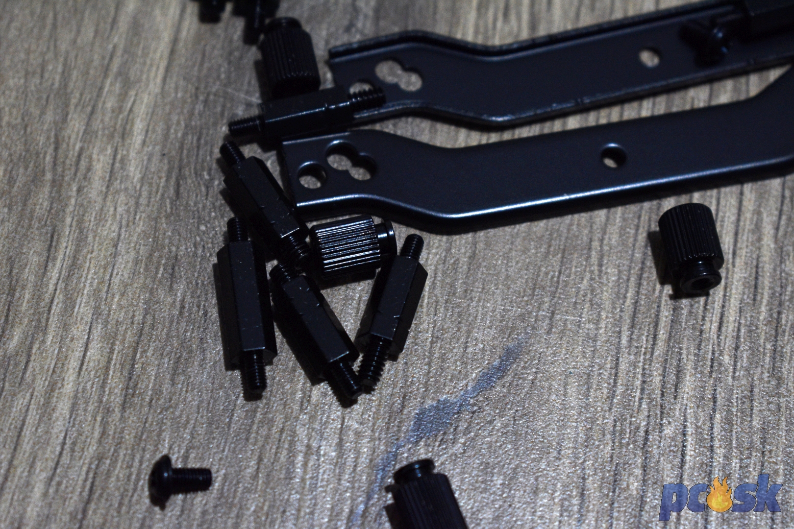 Na samotný chladič priskrutkujte prítlačné spony (každá drží na svojom mieste pomocou jednej skrutky) a chladič položte na procesor. Na pritiahnutie chladiča použite valcové matky – tie idú zatiahnuť aj rukou, ale pre čo najlepší kontakt chladiča s procesorom ich dotiahnite skrutkovačom.
