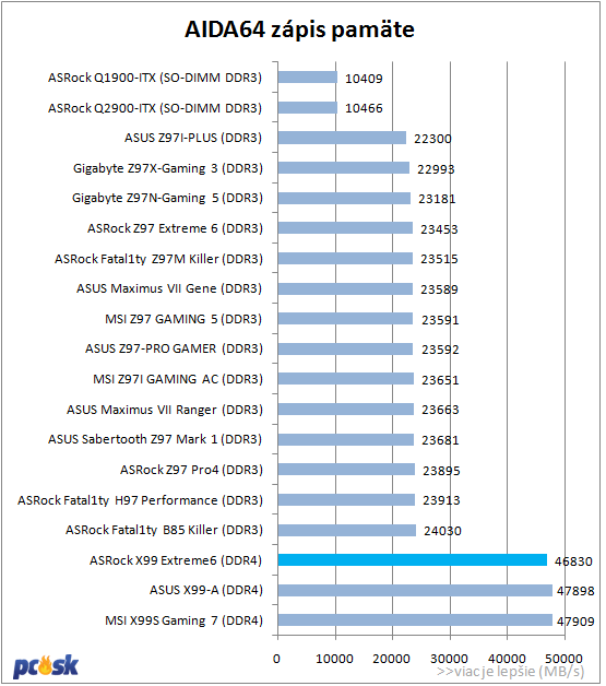 X99 Extreme6 sa napriek pamätiam s rovnakým nastavením radí za predchádzajúce 2 X99 dosky. Vplyv na to môže mať slabší pamäťový radič v procesore alebo pravdepobone aj fakt, že nejde o rovnaký model DDR4 pamätí.