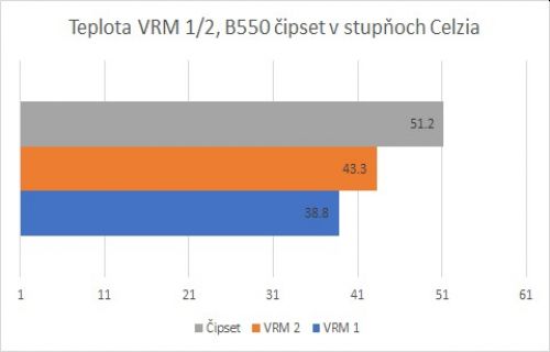 Pasívy na TUF Gaming odvádzajú skvelú prácu - po niekoľkohodinovom benchmarkovaní a práci s PC sa teploty VRM nevyšplhali vyššie ako 38,8 resp. 43,3 stupňov Celzia. Samotný čipset B550 má najmenší pasív bez rebrovania - tam sa teplota vyšplhala na 51,2 stupňa. Dosku som testoval na open bench s nulovým airflow. V uzatvorenej skrinke budú teploty pravdepodobne o niečo vyššie ale nič o čo by ste sa museli starať. Navyše ak budete mať v skrinke aspoň 3 ventilátory prievan v nej bude dostatočný.
