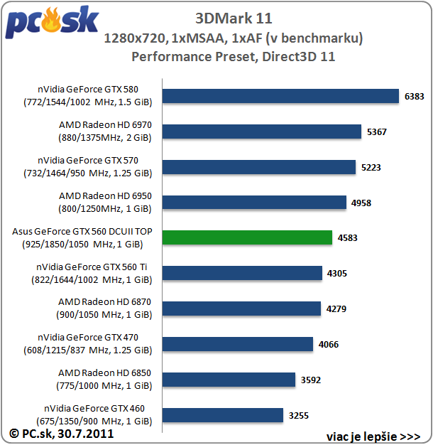 Výkonový rozdiel spôsobený menším počtom jednotiek (GTX 560 vs GTX 560 Ti) doháňa TOP verzia od Asusu vysokými pracovnými frekvenciami. V priemere je o nejaké to percento rýchlejšia ako referenčná GeForce GTX 560 Ti.
