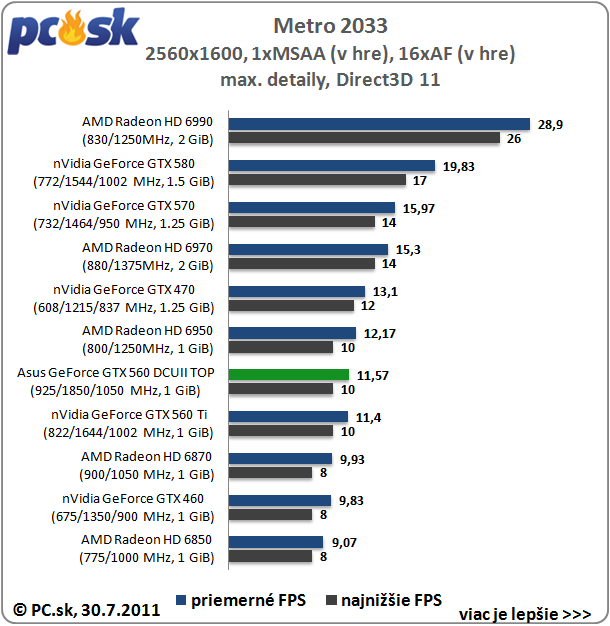Pre výpočet pomeru výkon/cena používam priemerné ceny z Heureka.sk, Tichepc.sk, Agem.sk, Alza.sk. Použité ceny pre: GeForce GTX 460 150 eur, GeForce GTX 470 185 eur, Asus GeForce GTX 560 DirectCUII TOP 190 eur, GeForce GTX 560 Ti 208 eur, GeForce GTX 570 303 eur, GeForce GTX 580 437 eur, Radeon HD 6850 152 eur, Radeon HD 6870 179 eur, Radeon HD 6950 1GiB 216 eur, Radeon HD 6970 308 eur.