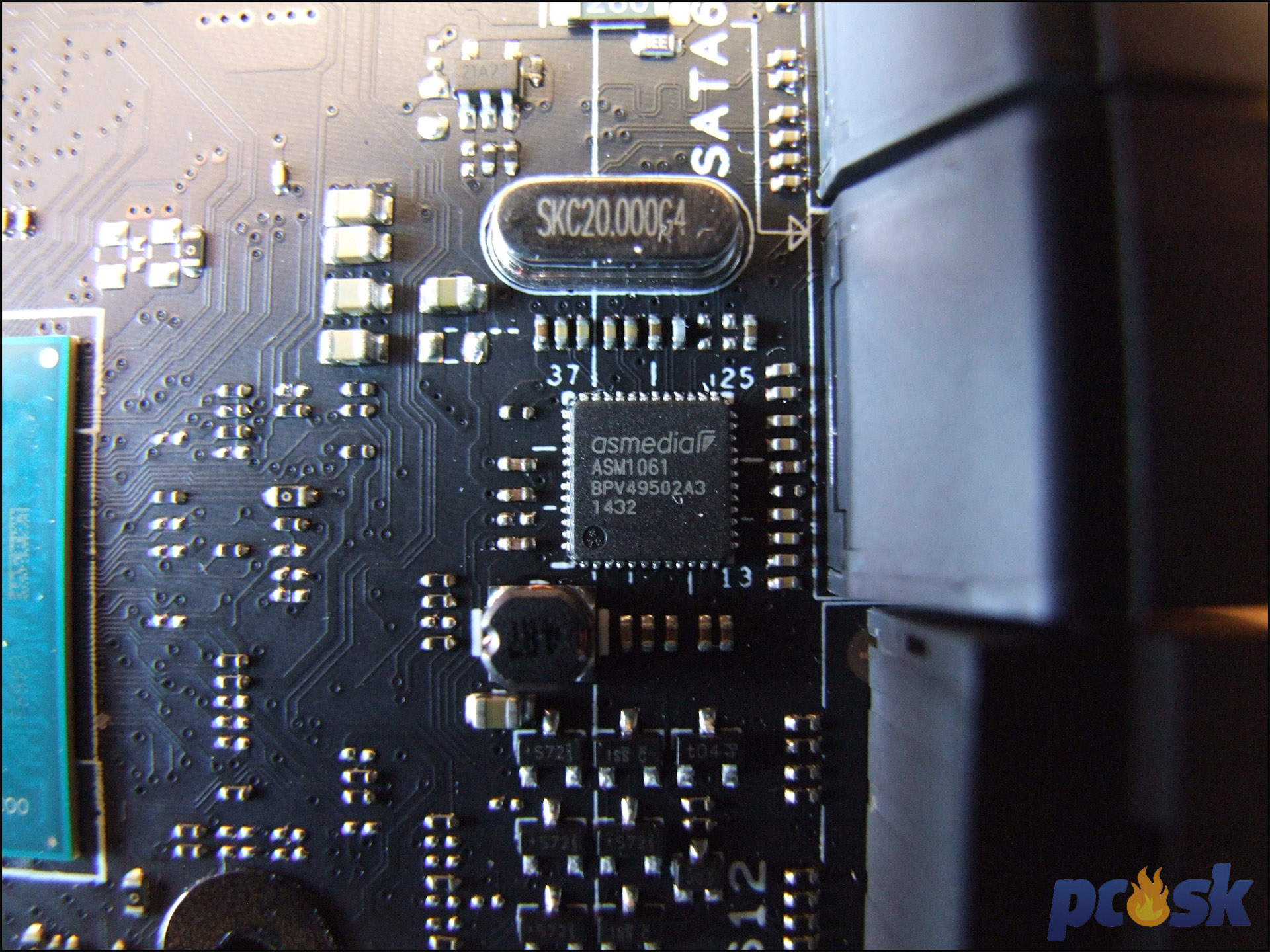 Čipset chladí elegantný pasív, ktorý pevne drží dvojica skrutiek. Podsvietenie pasívu zabezpečujú LED na doske, nie v pasíve. Pasív ukrýva aj ASM1061 radič pre 2 SATA3 porty.