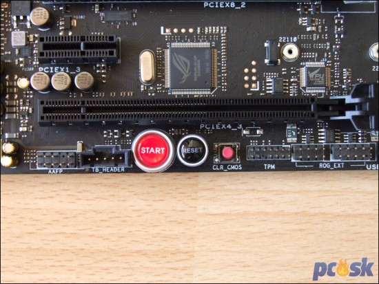 Nad posledným PCIe x16 slotom sa nachádza TPU čip riadiaci pretaktovanie a veľký ROG čip, ktorý ovláda periférie pripojené cez ROG_EXT konektory.