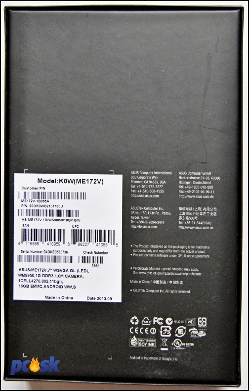 Na čelnej strane škatule je vyobrazený len samotný tablet a jeho označenie. Na ľavej strane je označená farebná alternácia zariadenia v škatuli (jedna z troch možných). Zadná strana obsahuje len konkrétne špecifikácie tabletu a zopár kontaktných údajov na továrne v Taiwane. Jednoduché, ale účelné balenie.