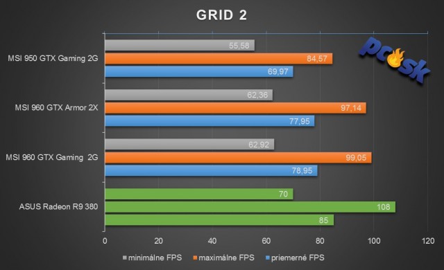 V hre GRID 2 využívam integrovaný benchmark, pričom test opakujem 3×. Priebeh FPS testujem pomocou FRAPSu.