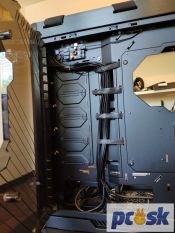Veľmi kladne hodnotím Asus za vyriešenie zakrytia káblov na druhej bočnej strane. Veľa výrobcov na tento detail pri skrinkách s obidvoma sklenými bočnicami zabúdajú a káble, ktoré ste ťahali zadnou stranou skrinky sú vidieť. Asus na zadnú stranu pripevnil tmavé plexisklo, ktoré je možné počas montáže zhodiť a po dokončení kabeláže, opäť nahodiť. Káble sú tak ukryté pod plexisklom a nepôsobia rušivo.