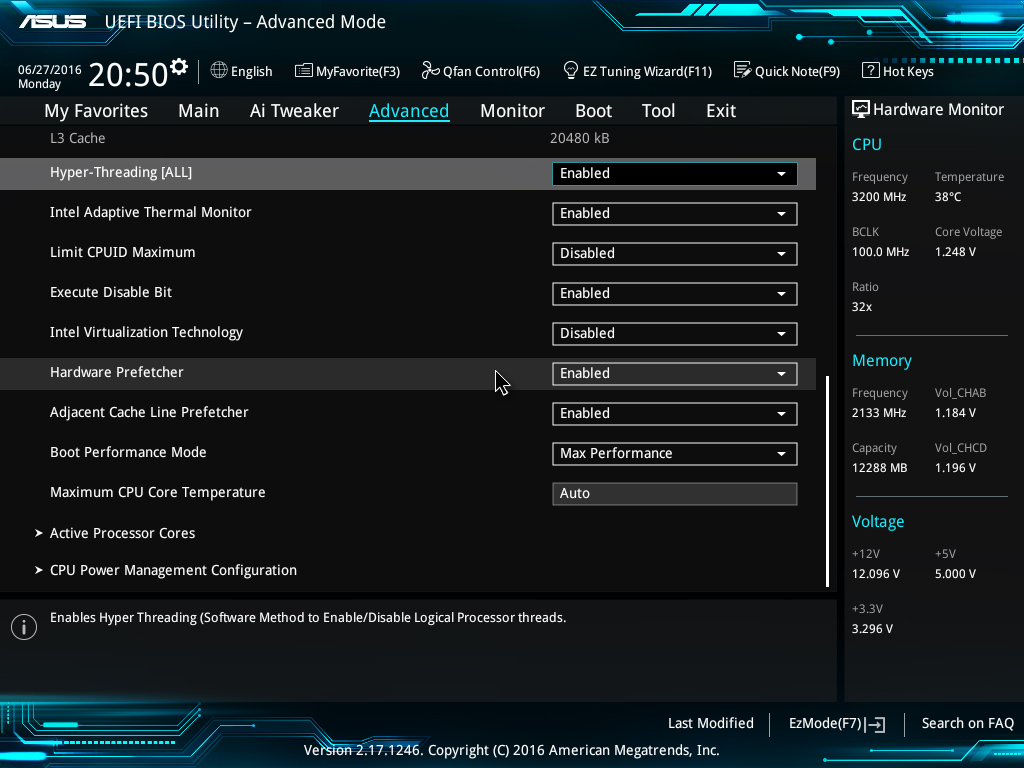 V karte Advanced môžete zapnúť/vypnúť niektoré funkcie procesora (HyperThreading, šetriace funkcie), vypínať jednotlivé USB porty, SATA porty, LAN porty, Wi-Fi/Bluetooth či podsvietenie. To je možné regulovať aj priamo z BIOSu, pričom je možné meniť režim svietenia a farbu.