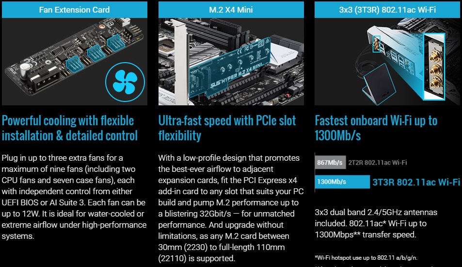 Karta pre ventilátory nie je jedinou a ASUS ponúka ešte kartu pre M.2 disky do PCIE slotu a na zadnom paneli nájdeme 3x3 Wi-Fi/Bluetooth modul s rýchlosťou do 1300Mbps vďaka podpore štandardu 802.11ac.