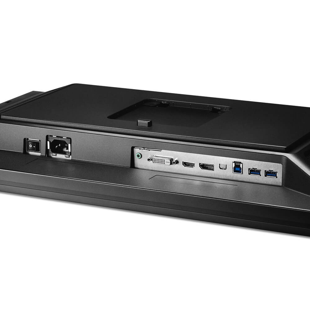 Spotrebu monitora som presnejšie nemeral, ale podľa výrobcu dosahuje až 105W, na PC monitor ide o značného žrúta. Typická spotreba je ale sotva polovičná. Malou náplasťou je zabudovaný adaptér priamo do monitora. Po stránke konektivity netreba mať žiadne obavy, monitor disponuje duálnym DVI-DL a dvojicou HDMI, jeden je žiaľ, trošku nepochopiteľne vo verzii 1.4, kedy podporuje maximálne 4K30. Našťastie tu máme ale HDMI 2.0 a DP 1.2, pričom obe porty sú schopné prenášať 4K60. Monitor má zabudovaný dnes už pomaly nastupujúci USB-HUB. Aby nebolo málo, výrobca zabudoval až 4× USB vo verzii 3.0. K tomu je ešte jeden vstupný USB 3.0. Monitor je tak ideálna voľba k notebooku, pretože Vám dokáže rozšíriť notebook až o 4 rýchle porty. Nechýba ani rýchle nabíjanie, podľa mojich testov s prúdom 2A.