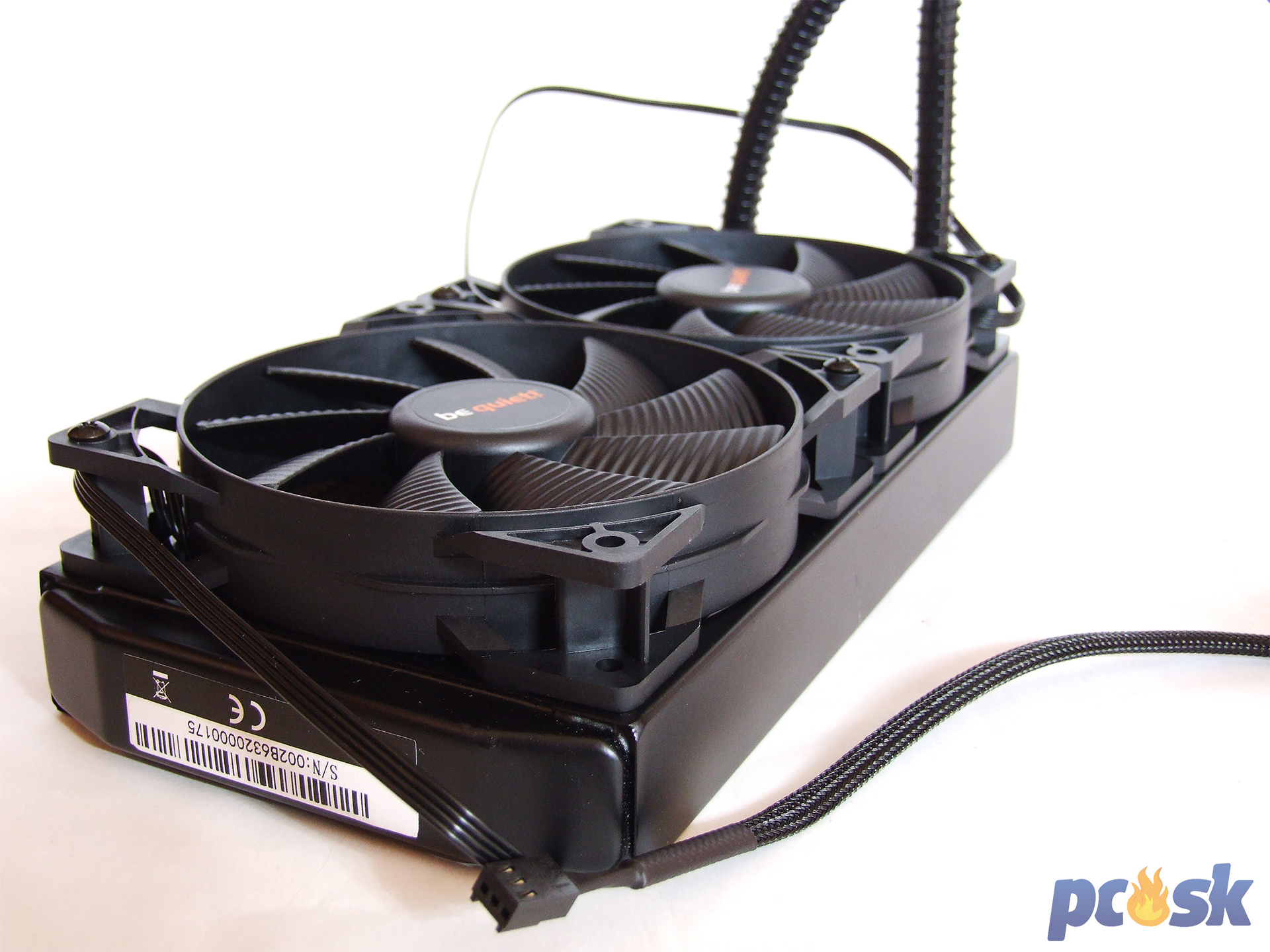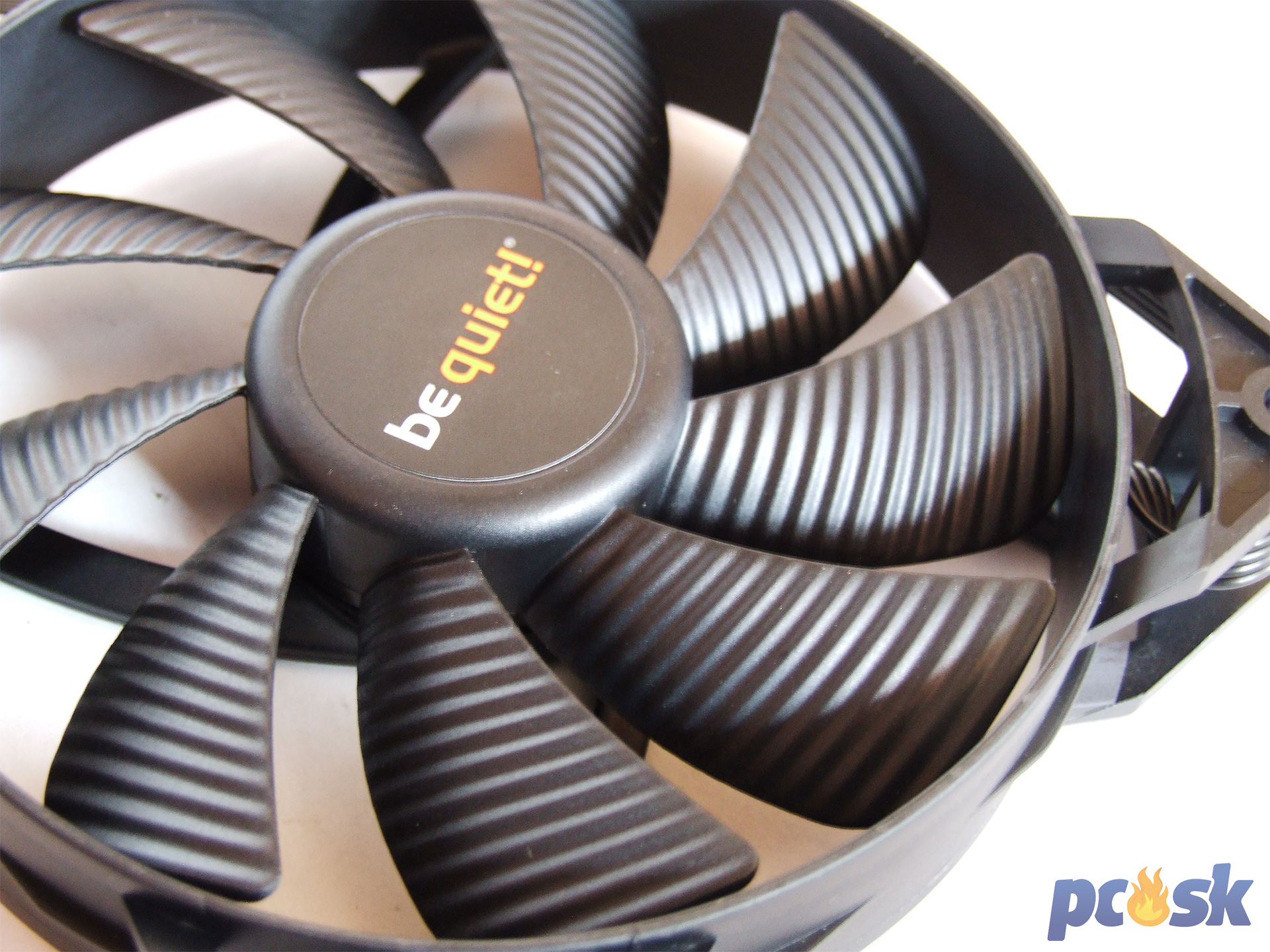 O prefuk radiátora sa bude starať dvojica ventilátorov Pure Wings 2 s priemerom 120 mm. Ventilátory majú 9 výrazne vrúbkovaných lopatiek, ktoré sa budú točiť maximálne rýchlosťou 2000 RPM. Výrobca neudáva minimálnu hranicu, mne sa ich podarilo zregulovať najmenej na 900 RPM čo je stále pomerne veľa. Ložiská sú typu Rifle a životnosť udávaná na 80 000 hodín. Káble sú dostatočne dlhé (až 45 cm) a samozrejme 4-pinové s PWM.