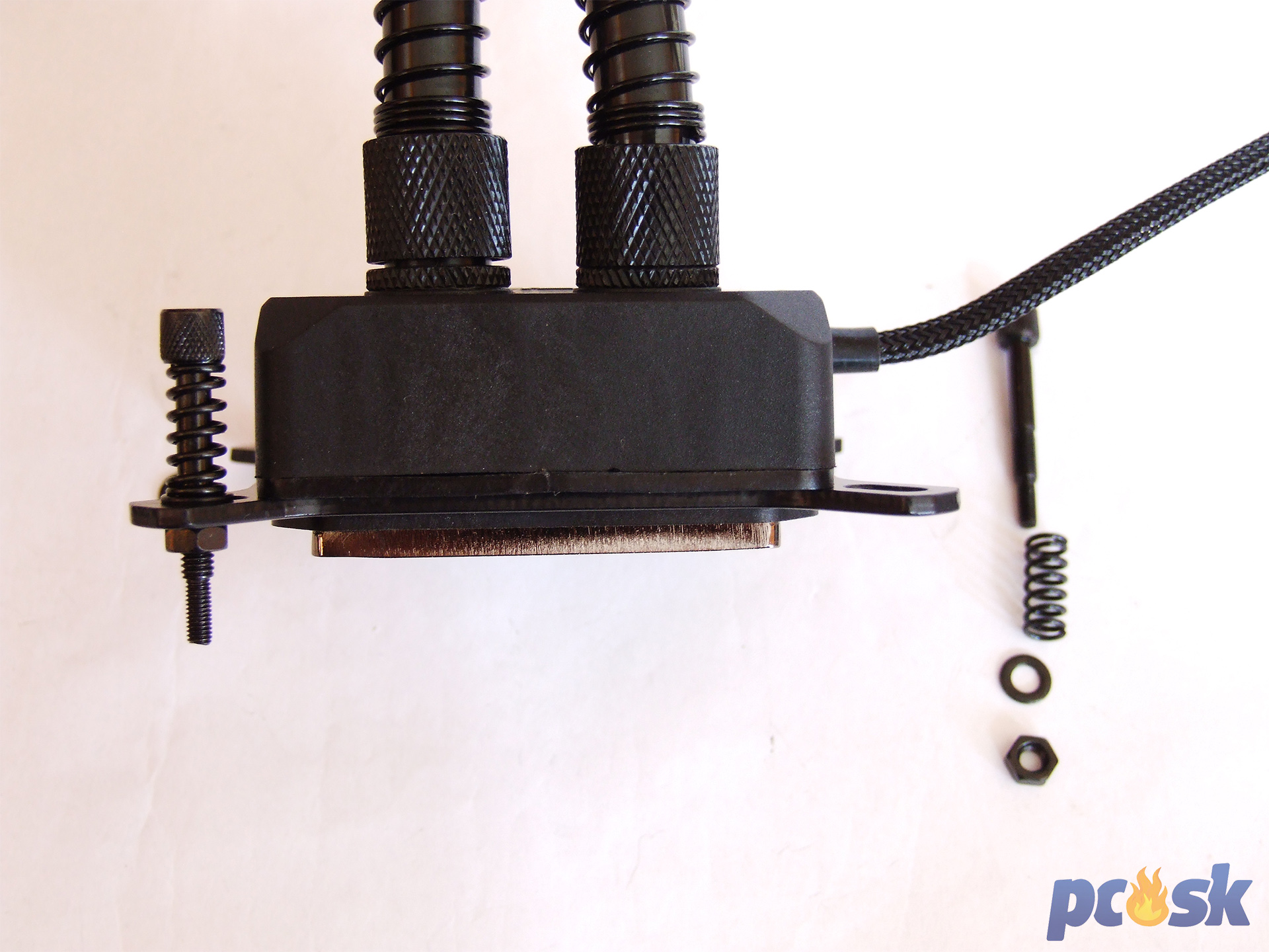 Tento fakt mi montáž trochu komplikoval, no nie nejak dramaticky. Celý princíp montáže je aj naďalej totožný s montážou Fractal Design Kelvin S24. Na pumpu je tak potrebné z boku nasadiť kovové rámy či už pre Intel alebo AMD. Do rohov tohto rámu je potrebné nasadiť skrutky v poradí skrutka, strunka, podložka, montážny rám a dotiahnuť to maticou. Odporúčam však skrutky nedoťahovať príliš silno aby ste ich vedeli v otvore posúvať podľa socketu.