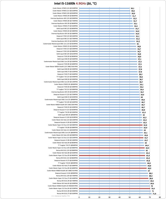Pridanie druhého ventilátora pomohlo viac než som popravde čakal. Cooler Master 212 X Duo dokázal prejsť testom takmer pri celom spektre RPM svojich ventilátorov. Iba pri nastavení 5V nedokázal uchladiť testovací CPU, ktorý dosahuje takmer 220W. Pri cene 36 Eur je toto parádny výsledok. Treba si však uvedomiť, že na dosiahnutie takéhoto výkonu, sa musia točiť ventilátory na vyššie otáčky - aj "slabých" 6V znamená 1320RPM, čo ani zďaleka nie je pre tiché zostavy.
