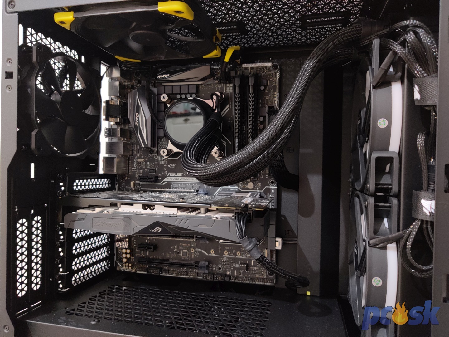 Pri montáži komponentov som tentokrát siahol po AiO riešený z dielne Fractal Design – Celsius+ S28 Prisma, ktorý smeroval do prednej časti, doske Asus Z170 + RX570 a ako doplnok celej zostavy ventilátor Noctua so žltými antivibračnými podložkami a káblikmi.