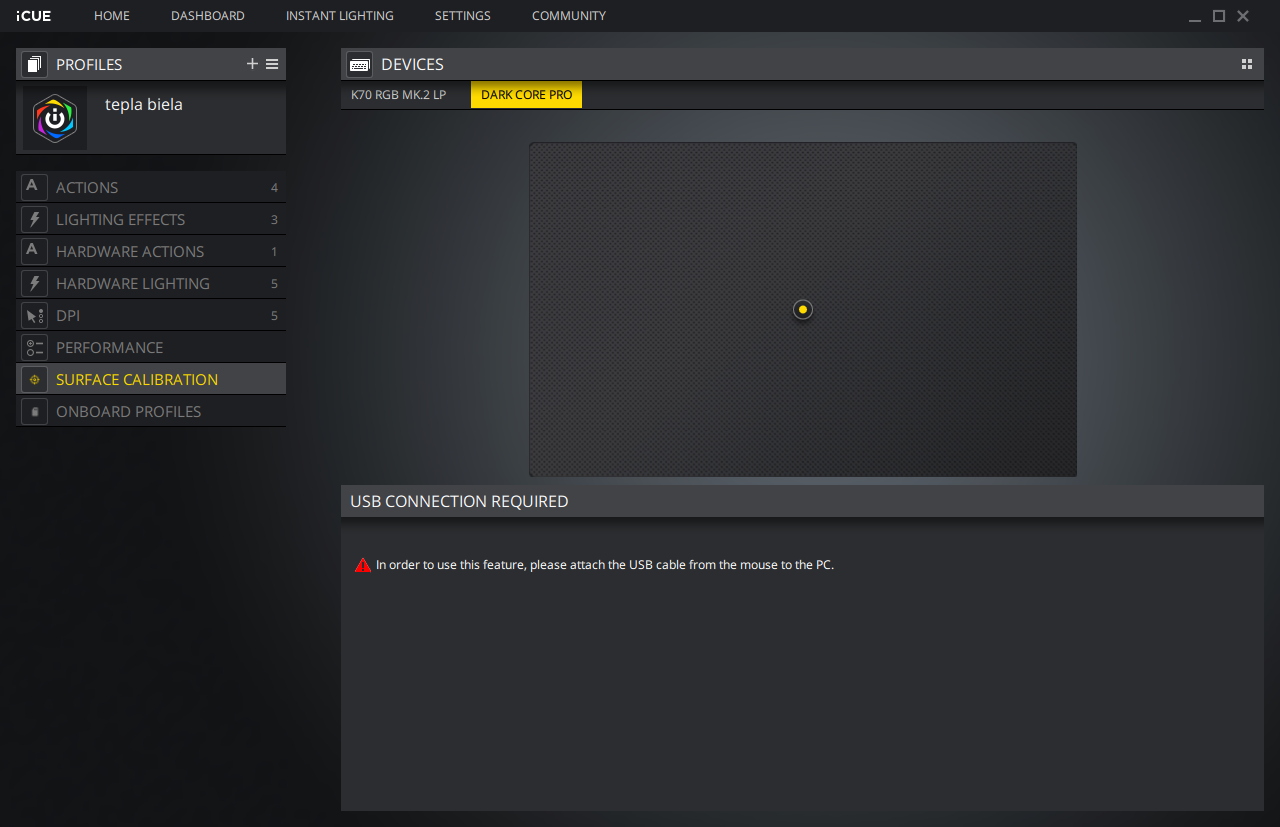 Na ovládanie podsvietenia myši Corsair Dark Core RGB Pro, ale aj jej celkové nastavenie, slúži aplikácia iCue. Táto aplikácia združuje prakticky všetky herné periférie od Corsairu a obsahuje neuveriteľné množstvo funkcií a nastavení. Výhodou takto komplexného softvéru je prepojený ekosystém, v ktorom môžu rôzne zariadenia od Corsairu o sebe „vedieť“ a vzájomne spolupracovať a dopĺňať sa. V prípade viacerých kompatibilných zariadení tak môže jeden efekt začať na myší a následne pokračovať na klávesnici.