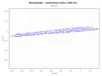 Toľko k základnému popisu metodiky. Keďže sa jedná o myš, ktorá dokáže fungovať v káblovom aj bezdrôtovom režime, otestujeme a porovnáme si oba režimy. Naviac, Mouse Tester podával v 2000 Hz režime neobvyklé výsledky, a tak som k pôvodným grafom pridal aj test s 1000 Hz polling rate. Grafy sú teda zoradené v poradí 2000 Hz bezdrôtový režim, 2000 Hz káblový režim, 1000 Hz bezdrôtový režim, 1000 Hz káblový režim.