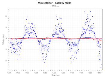 Velocity vs Time - program z nameraných dát (počet správ, časový interval medzi nimi a DPI) vypočítava rýchlosť, akou sme hýbali myšou. Počas testu sa s ňou snažíme pohybovať čo možno najrýchlejšie, čím sa dajú odhaliť ďalšie problémy senzora, ktorý môže zlyhávať pri rýchlych/trhavých pohyboch myši. Opäť je dôležité zachovanie rovnomerného rozloženia bodiek okolo spriemerovanej trajektórie.