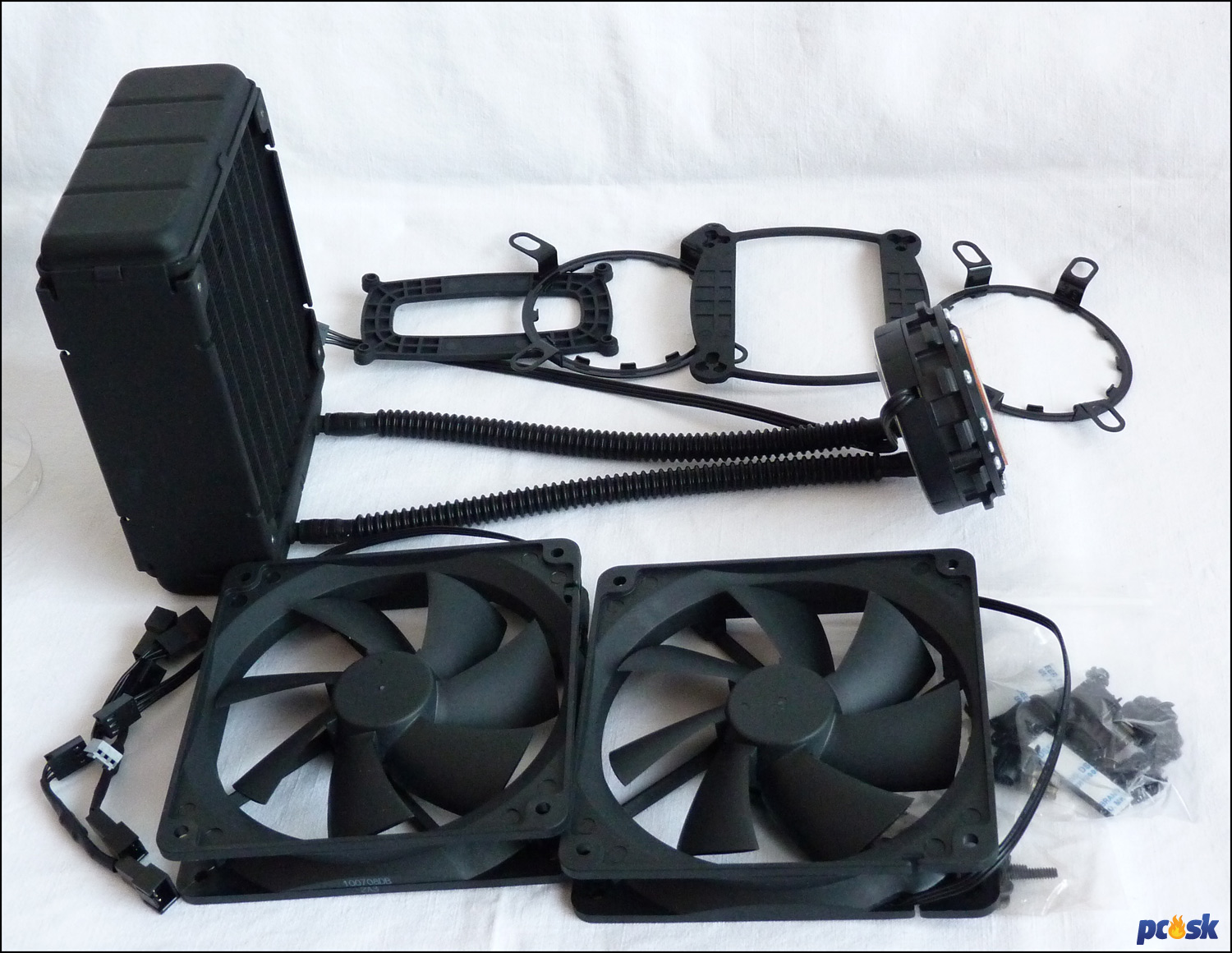 Samotný chladič je taktiež kompletne v čiernom prevedení, vrátane lamiel radiátora. Samozrejme je celý systém vopred naplnený chladiacim médiom, pravdepodobne vody s určitými prísadami. Hneď po vybalení a miernom zatrasení je počuť, že v okruhu je aj trocha vzduchu – v radiátore, resp. jeho „expanzke“ to trocha žblnkoce. Aj po zapnutí sa na chvíľu ozývajú z pumpy zvuky z prechádzajúcich bublín, po chvíli sa všetko ustáli a chladič pracuje normálne. Odporúčam teda aj kvôli tomuto dbať na orientáciu pri montáži – nikdy nedávajte radiátor do skrinky tak, aby hadice boli na vrchu. Pumpa by potom nasávala vzduch, ktorý sa drží hore.