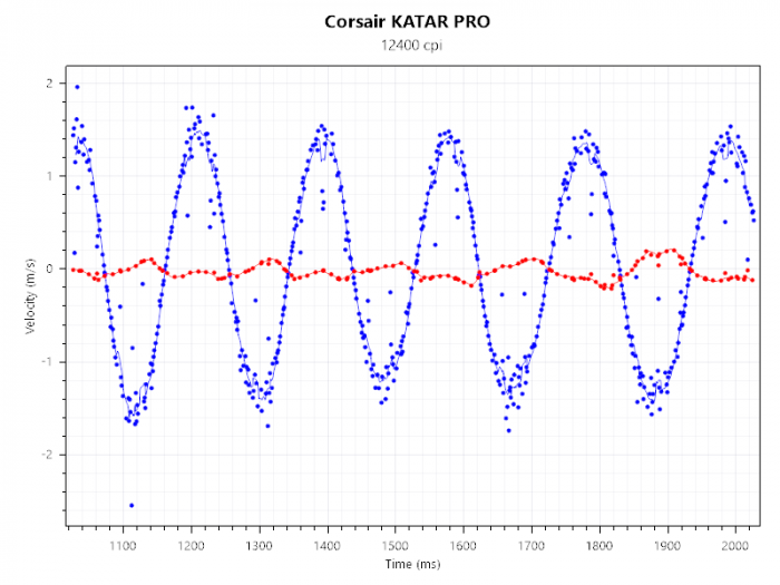 Velocity vs Time - program z nameraných dát (počet správ, časový interval medzi nimi a DPI) vypočítava rýchlosť, akou sme hýbali myšou. Počas testu sa s ňou snažíme pohybovať čo možno najrýchlejšie, čím sa dajú odhaliť ďalšie problémy senzora, ktorý môže zlyhávať pri rýchlych/trhavých pohyboch myši. Opäť je dôležité zachovanie rovnomerného rozloženia bodiek okolo spriemerovanej trajektórie.