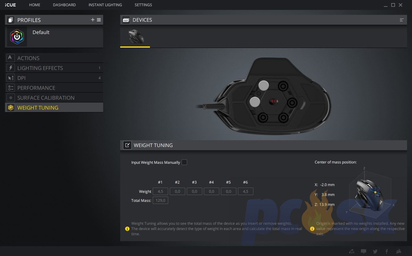 Dominantou tejto myšky je umiestnenie akéhosi akcelerometra, ktorý meria centrum hmotnosti myšky. Vďaka tejto funkcii vidíte, ktoré závažia máte vložené na ktoré miesto, čo umožňuje elegantne zmeniť priesečník hmotností. Myška sa tak dokáže prispôsobiť a iná hmotnosť bude pôsobiť vo vertikálnom i horizontálnom pohybe, rovnako ako pri pohybe vľavo a vpravo. Musím povedať, že táto funkcia sa mi veľmi páči. Závažie sa vkladá do priestoru, kde je gumička merajúca hmotnosť. Najlepšie by som toto usporiadanie porovnal s konštrukciou membránovej klávesnice.