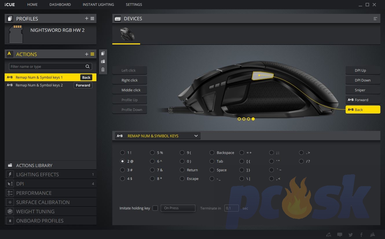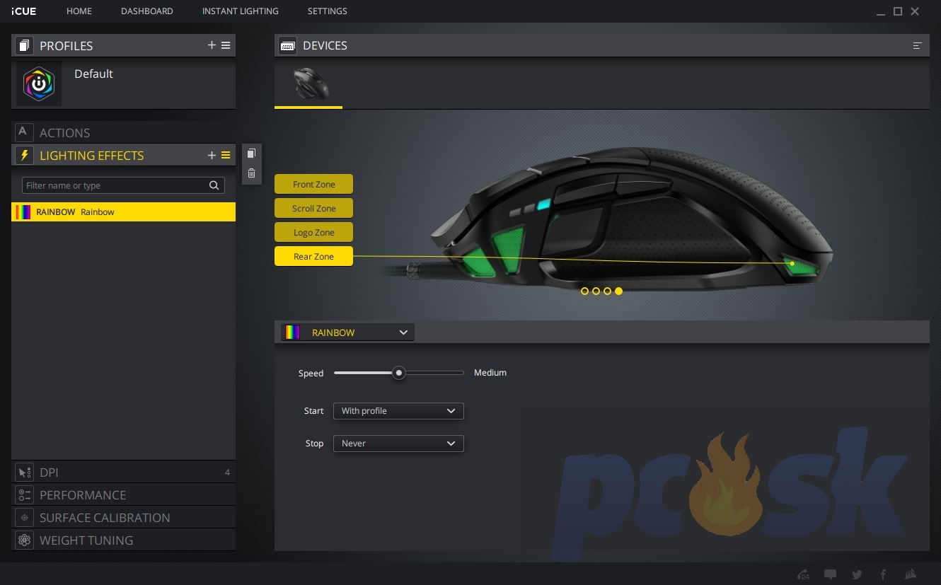 Softvérovú časť zabezpečuje prepracovaný program nazvaný iCUE = Corsair Interface. Ten združuje všetky dostupné, resp. inštalované Corsair zariadenia – od skrinky cez periférie až po RAMky a chladiče. Umožňuje sledovať teplotu zariadení ako aj frekvencie procesora či pamätí. Položka Dashboard poskytuje všetky základné informácie o počítači vrátane nastavenia DPI samotnej myšky. Položka Instant Lighting zase umožňuje synchronizovať podsvietenie Corsair zariadení. Po vybratí zariadenia sa nám odomknú rozšírené nastavenia, kde nájdeme makrá, ovládanie podsvietenia, nastavenie DPI, či kalibráciu povrchu, na ktorom sa myš používa. Nastavenia zase slúžia na aktualizáciu firmvéru, nastavenia jasu podsvietenia či polling rate (až 1kHz). Myš za dobu používania asi 3 týždne dostala jednu aktualizáciu na v3.35. Samozrejmosťou je tiež možnosť ukladať profily do myšky a rovnako ich aj mazať. DPI je možné nastaviť od hodnoty 100 až po 18 000. Individuálne je tiež možné nastaviť X-ovú aj Y-novú osu. Samostatne nastaviteľné je tiež tlačidlo „SNIPER“. Môžete si vybrať či chcete využívať hodnotu skrytú pod tlačidlom „SNIPER“ len počas držania alebo budete funkciu zapínať a vypínať. iCUE patrí jednoznačne k najlepším riešeniam na trhu.