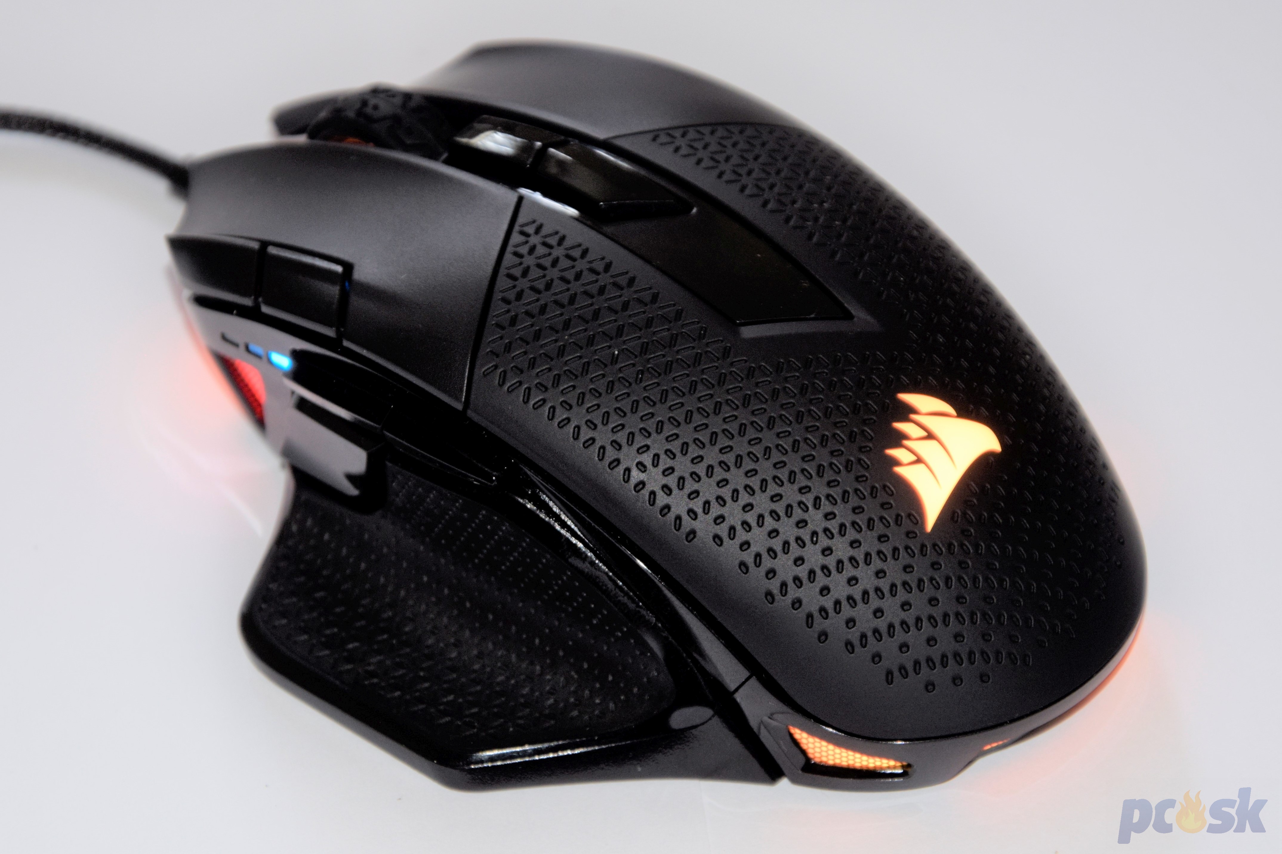 Koliesko myši si prešlo evolúciou a po novom má hlboké drážky (minimálne v porovnaní s M65) a odpor kolieska je tak akurát. Logo Corsair ako aj zadná časť myši je podsvietená RGB LEDkami. Tri malé LEDky má tiež prepínač DPI, umiestnený pomerne netradične pod pravým tlačidlom. Nad ním sa však nachádza predvolený prepínač DPI (dvojica tlačidiel), takže toto umiestnene je veľmi logické. Viete veľmi rýchlo pohľadom zistiť akú citlivosť máte aktívnu.