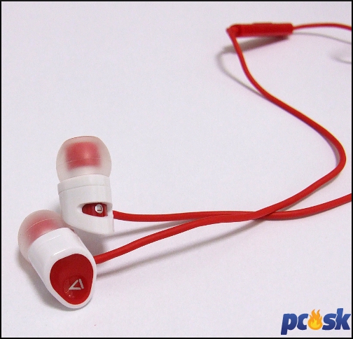 Samotné slúchadlo je tvarované ako nábojnica. Z vonkajšej strany je tento valec zrezaný pod určitým uhlom. Celkovo sú slúchadlá tvarované tak, aby po vsadení do ucha príliš netrčali, a to sa podarilo. Z ucha Vám bude vytŕčať skutočne len malý kúsok. Ten je zafarbený podľa vybranej farebnej schémy a nechýba tu ani logo firmy Creative.