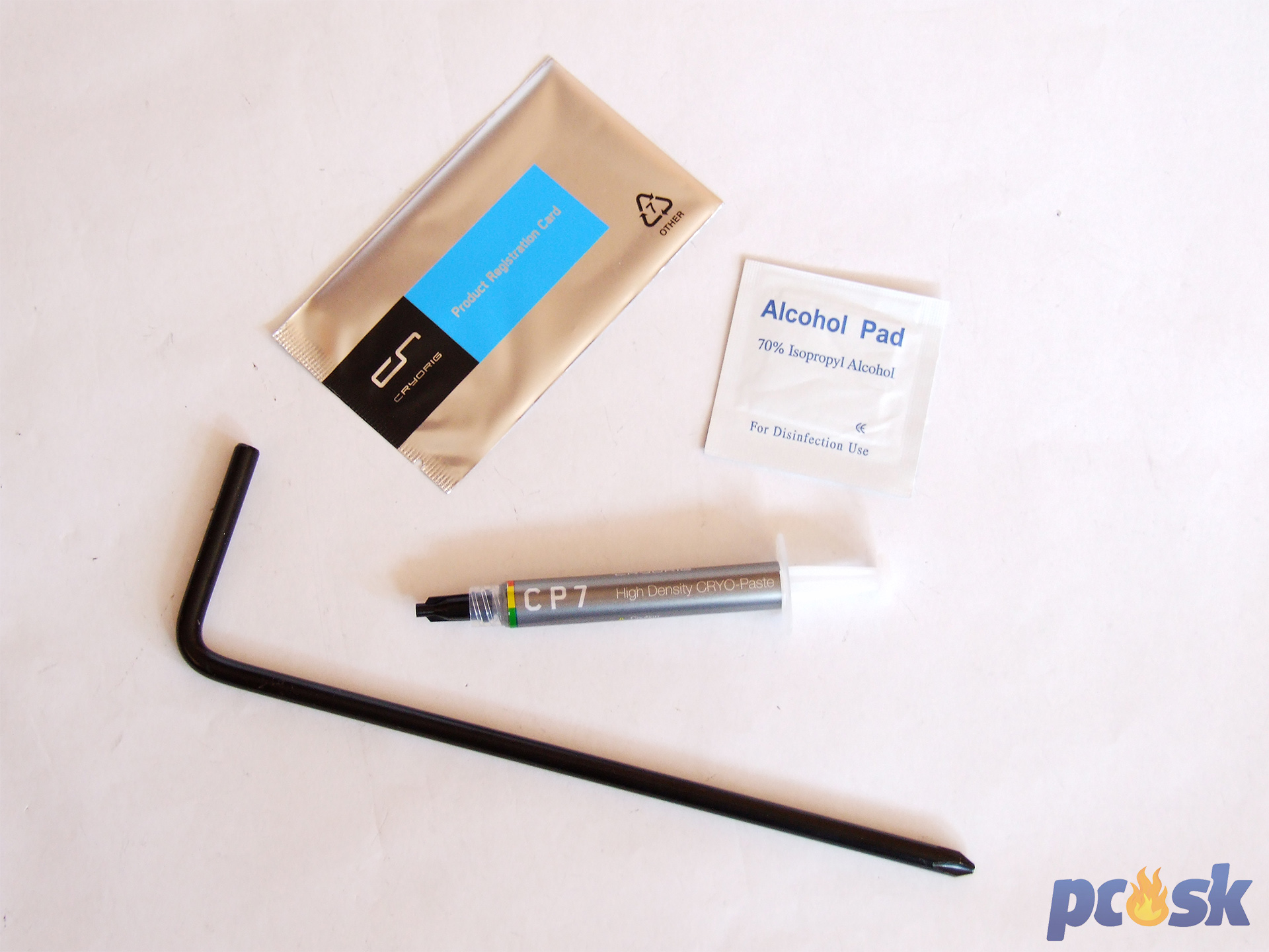 Drahý chladič by si zaslúžil poriadnu porciu príslušenstva a tá našťastie nechýba. Je precízne zabalená v samostatnej škatuli, ktorá už sama na sebe nesie popis kompletného príslušenstva. Jednotlivé časti sú v antistatických vreckách a v oddelených priehradkách. Moju pozornosť upútala najmä veľká tuba teplovodivej pasty CP9, čistiaca podložka s izopropylalkoholom na čistenie základne, registračná karta, Y-kábel, veľký skrutkovač v tvare L (podobný pribaľuje Noctua) a 4 spony pre ventilátory spolu s antivibračnými podložkami. Tieto spony a podložky ma prekvapili o to viac, že ventilátory sú už od výroby osadené na chladiči aj s podložkami a dodatočné spony a podložky tak nemáte kde využiť. Do úvahy tak prichádza možnosť osadiť tretí ventilátor, stále vám však zostanú 2 spony. Výrobca ich tak zrejme pribaľuje ako poistku keby ste nejaké spony stratili či zlomili.