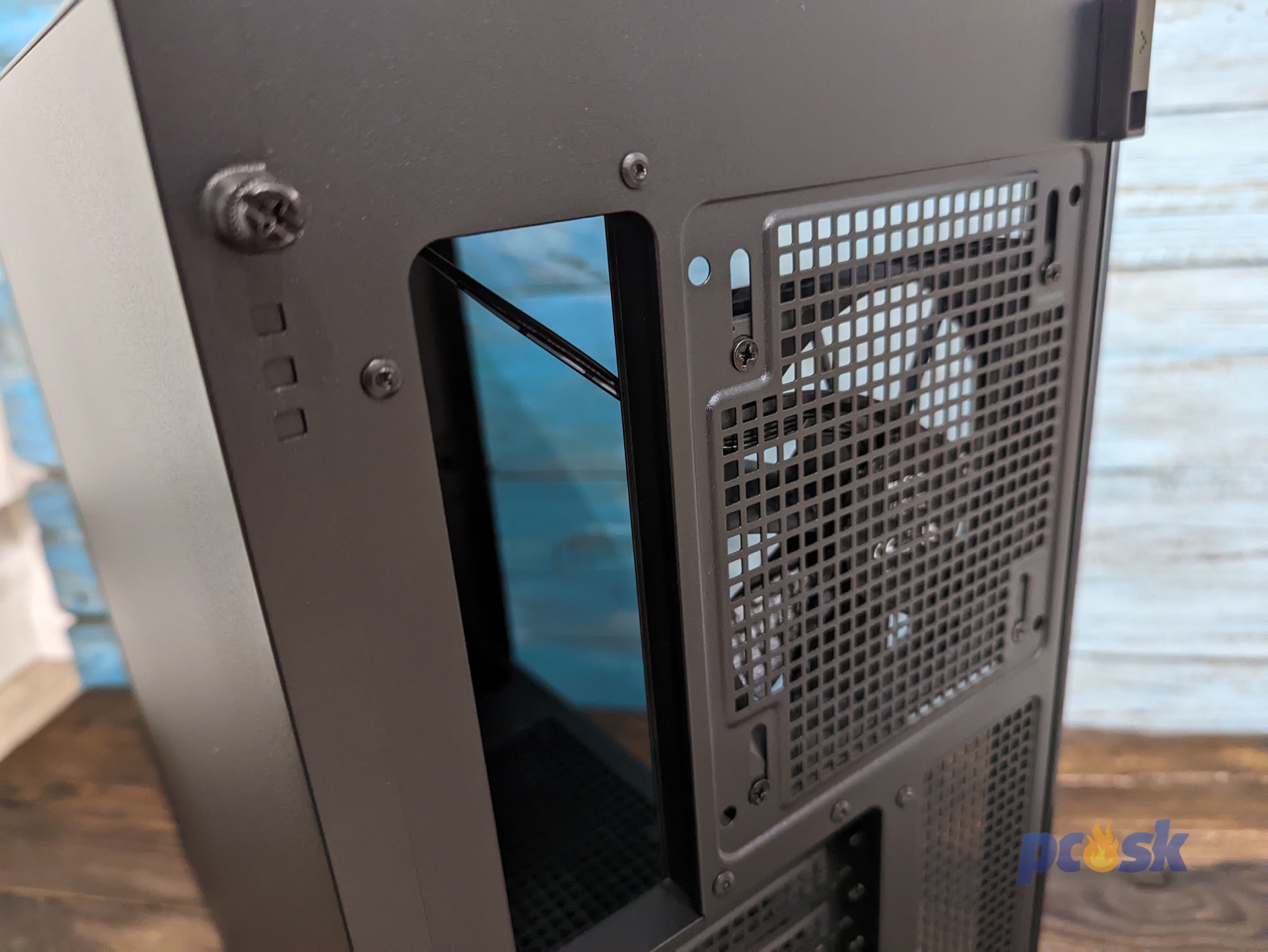 DeepCool CH 510, rovnako ako väčšina skriniek tohto výrobcu myslí hlavne na chladenie. Celkový počet ventilátorov, ktorý sem dostanete je 9 – 120mm ventilátorov a 5 – 140mm ventilátorov. V skutočnosti počítajte so 7x120, pretože dve pozície na PSU shroude sú skôr len na usmernenie vzduchu od predných ventilátorov. Reálny prínos na chladenie je veľmi malý až zanedbateľný. Škoda, že od výroby príde skrinka len s jedným 120mm ventilátorom. Je jasné, že toto nebude dostatočné chladenie takmer pre žiadnu zostavu. Ventilátor je umiestnený v zadnej časti.