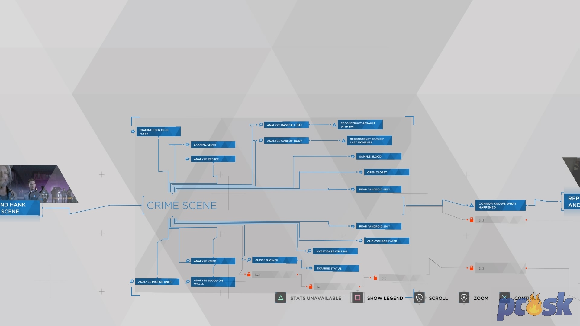 Pri niektorých nájdených objektoch – ako napríklad puzdro na zbraň v prvej misii - vám hra ponúkne z rekonštruovať udalosť, ktorá sa už stala na základe vami spravenej analýzy. Zistíte tak – spojler, že si Android sám zobral zbraň - spojler. Druhou kľúčovou a vlastne absolútne najdôležitejšou časťou hry sú dialógy. Na jednotlivé otázky alebo odpovede máte obmedzený čas – 10 sekúnd. Na výber sú vždy štyri odpovede/otázky. Svojimi otázkami a odpoveďami hneď od začiatku formujete príbeh misie a celej hry.