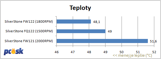 Na maximálnych otáčkach nemal žiadny z ventilátorov problém prejsť testom. Teplota okolia bola pri každom teste 21,4°C (+/- 0,1°C). Ventilátory FQ122 a FW122 podali na maximálnych otáčkach podobný výkon, pričom s redukovanými otáčkami na 1000RPM boli výsledky také, ako by logicky mali byť a aké som aj očakával - absolútne rovnaké. Ventilátor FQ122 (ultra-quiet) sa mi však subjektívne zdal aj tichší. Sčasti je to tým, že maximálne otáčky ma nastavené na 1500RPM (FW122 má 1800RPM), avšak aj na rovnakej rýchlosti ultra-quiet ventilátor bežal hladšie. Zrejme k tomu prispeli kvalitnejšia ložiská.
