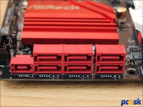 Ďalej od nich je 6 SATA3 portov natočených o 90°. Všetky sú vyvedené z čipsetu Z97. Vedľa nich si našiel miesto malý, no rýchly SATA Express konektor.
