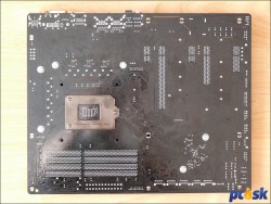 Layout dosky s formátom mATX nie je nijakým spôsobom neštandardný, hádam len prídavný konektor napájania PCIe slotov vybočuje z tradície. Zadná strana prezradí iba pripojenie PCIe slotov.