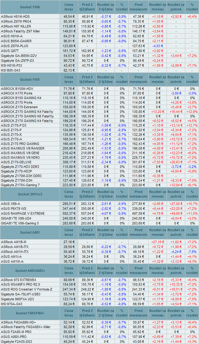 Základné dosky pre INTEL procesory zlacneli do 0,9%. U modelov pre AMD boli zmeny do -0,8%. Z prehľadu vypadli dosky MSI H97 GAMING 3 (1150) a Gigabyte Z170X-Gaming G1 (1151).