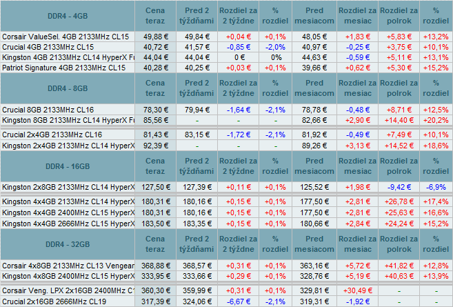 Pamäte DDR a DDR2 zdraželi do 1,3%. DDR3 menili ceny od +1,6% do -6,2% a DDR4 od +0,1% do -2,1%.