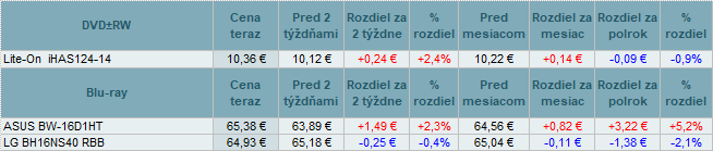Ceny DVD a Bluray napaľovačiek sa zmenili od +2,4% do -0,4%.