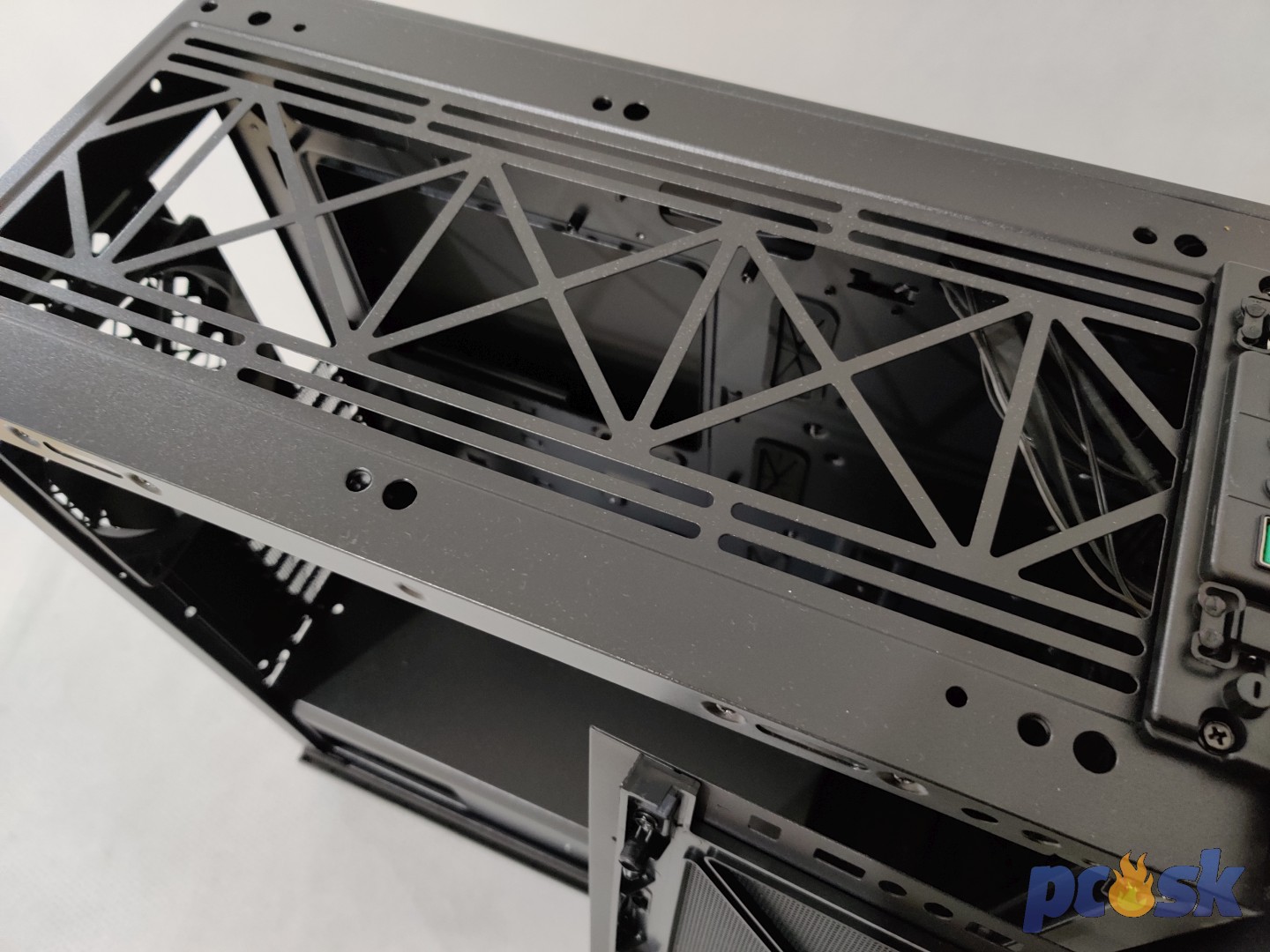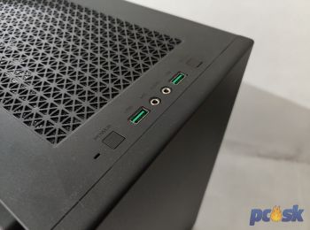 Na demontáž jednej, či druhej bočnice tak nepotrebujete skrutkovač. Ľavá bočnica (pri pohľade z predu) je z temperovaného skla – ak ju dávate na skrinku, treba spodnú časť vložiť do žliabku a následne pritlačiť hornú časť. Magnety sú dostatočne pevné a nemusíte sa báť, že by sa vám bočnice len tak uvoľnili. V hornej časti nájdete dva USB 3.0, audio in/out a tlačidlá pre zapnutie a reset PC.